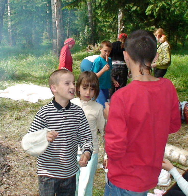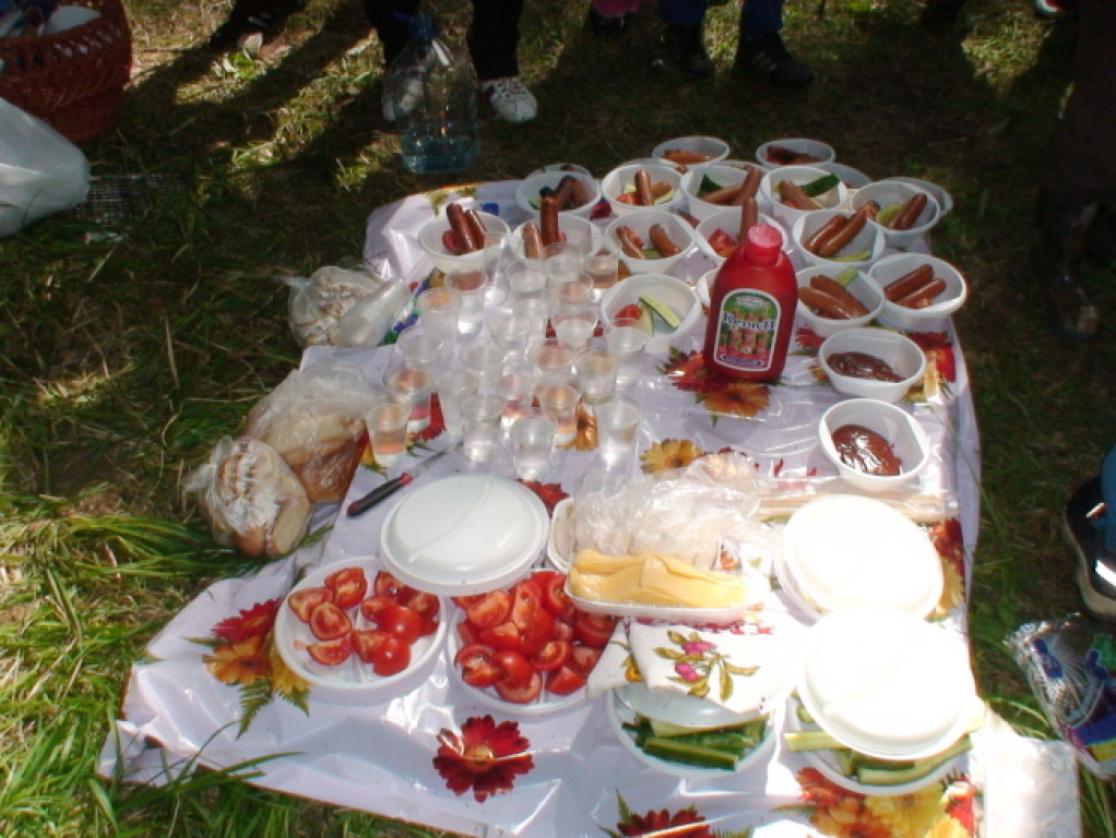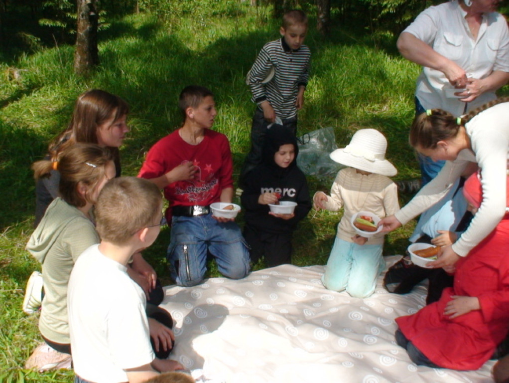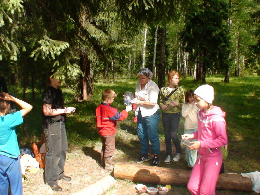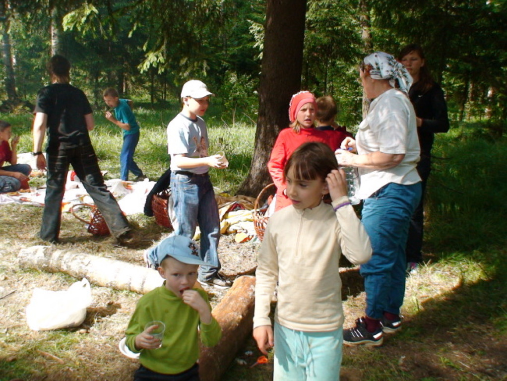 В воскресенье вместо обычных занятий учащиеся воскресной школы отправились на ближайшую лесную полянку. Так завершился 2009 - 2010 учебный год. 20 ребят, а также трое взрослых за время отдыха на природе уничтожили 6 килограмм сосисок, 2 килограмма огурцов, столько же помидор, а также несколько сладких рулетов, полкило сыра и 300 грамм сала. Сосиски жарили на костре и запивали колодезной водой, которой выпили 11 литров. Кроме этого ребята освоили новую спортивную игру. Играть в "Картошку" понравилось всем и большим и маленьким, несмотря на то, что в процессе "окучивания" картошке порядком доставалось мячом по спине, голове и другим частям тела. На лесной полянке ребята встретили лягушек, ящерицу, а также большое количество комаров. За исключением комаров, никакие животные серьёзно не пострадали. Весь мусор после трапезы ребята сожгли на костре, который затем залили заготовленной заранее водой. Ни комары, ни одиночные капли дождя не пугали ребят. Уйти с полянки они согласились только после того как закончились запасы пресной воды, предварительно взяв обещание с педагогов таким же образом отметить начало учебного года 2010 - 2011.