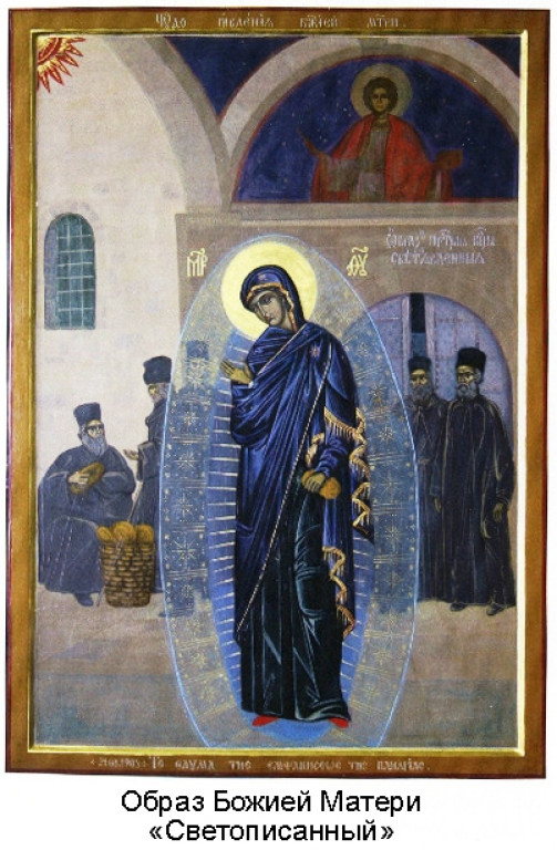 В память об этом чудесном случае на стене обители есть фреска, показывающая тот самый случай посещения Матери Божией во время раздачи милостыни. Светописанный образ Пресятой Богородицы вот уже более 100 лет глубоко чтится в русской святогорской обители, на Афоне и по всей Святой Руси.