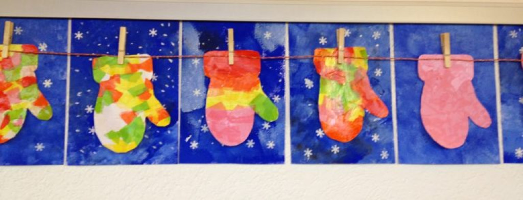 Образцом для такой варежки может стать рука ребенка, а “раскрасить” ее можно как угодно – например, приклеить обрывки бумаги как в примере. На лист бумаги приклейте прищепку – на ней будет висеть наша варежка. 2. Снеговики из бумажных стаканов