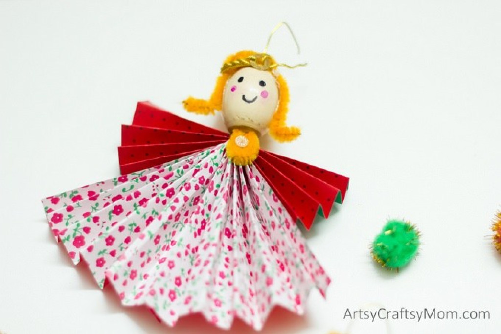 Для этих рождественских ангелов понадобятся квадратные куски бумаги (для платья и крыльев), пушистая проволока и большая деревянная бусина.
