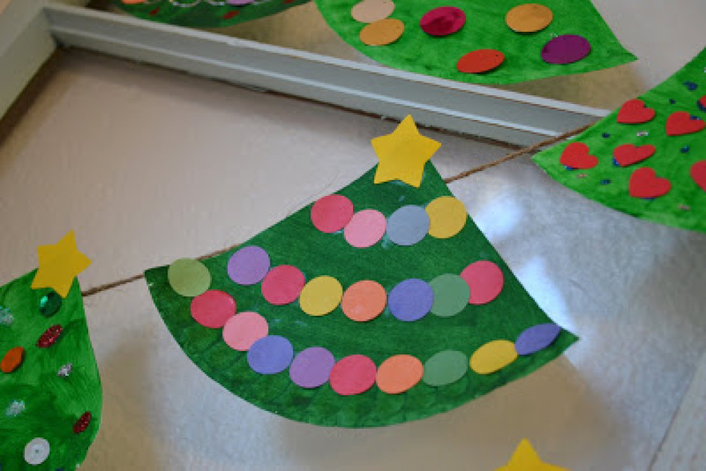 Для такой гирлянды понадобятся белые бумажные тарелки, зеленая краска и любые украшения (цветная бумага, блестки, наклейки, декоративный скотч). Разрежьте тарелки на 4 части, покрасьте в зеленый и дайте детям украсить их по своему вкусу. Лучше сделать сразу много елочек и приклеить их на бечевку – получится праздничная гирлянда, которая украсит детскую.