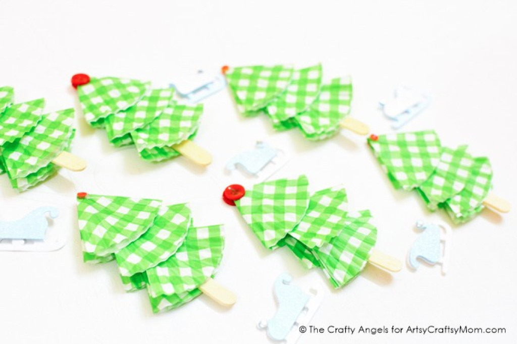 Для таких простых елочек понадобятся 3 формочки для кексов (лучше подобрать подходящие по цвету и рисунку), палочка для мороженого и любые украшения (на фото – маленькая пуговица). Дважды сложите каждую формочку и приклейте к палочке. Верхушку украсьте пуговицей, бусиной или звездой из бумаги. К игрушке можно приклеить петельку из нитки и повесить ее на елку.