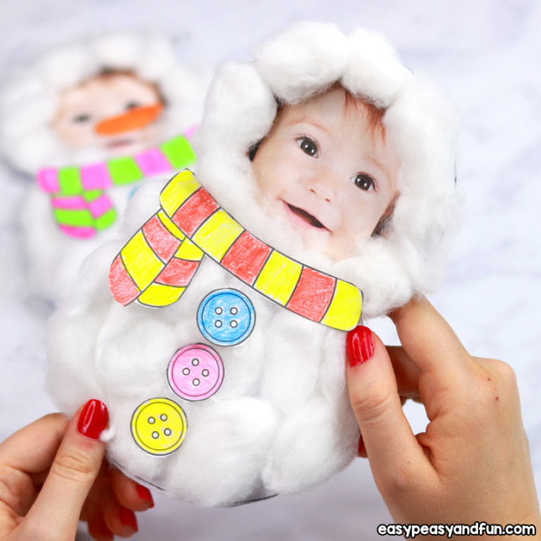 Замечательная открытка для бабушек и дедушек малыша. Вырежьте из бумаги снеговика, приклейте фото и “снег” (кусочки ваты). Украсьте снеговичка пуговицами, шарфом и бумажной морковкой.