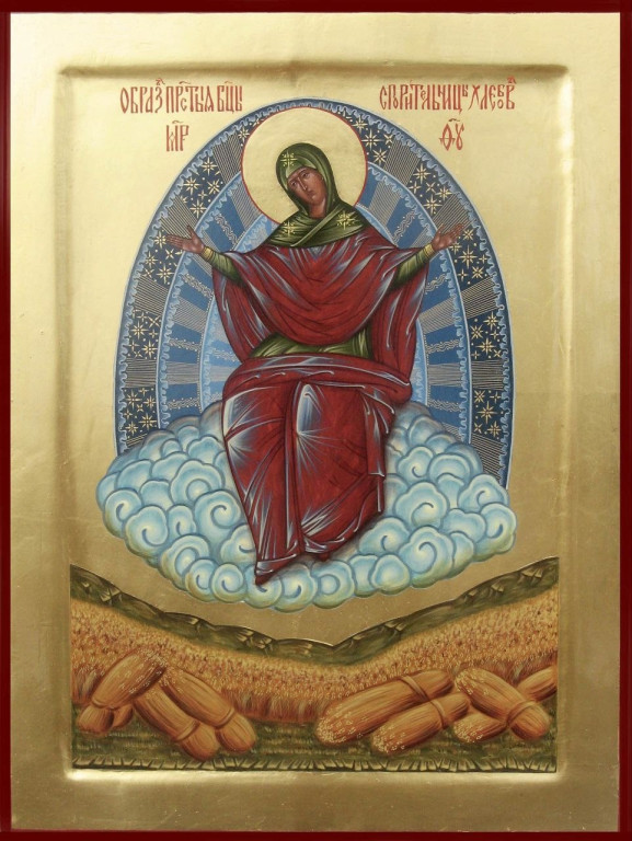 На этой иконе Божия матерь изображена сидящей на облаках. Ее руки распростерты на благословение. Внизу - сжатое поле, а на нем среди трав и цветов стоят и лежат снопы ржи.