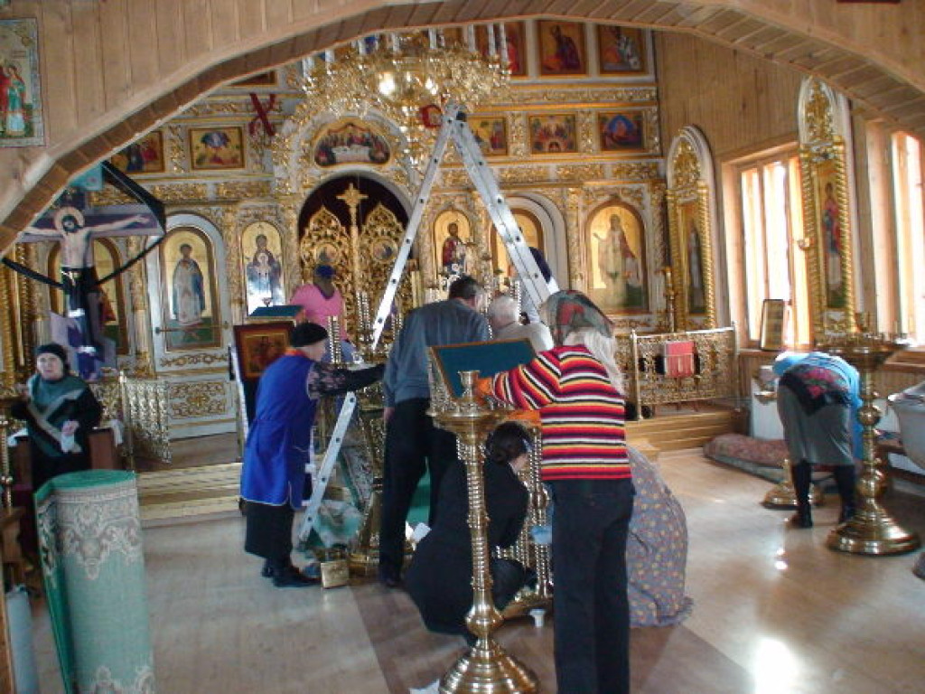 В храме идет активная подготовка к празднованию ПАСХИ. По традиции, впредверие самого Великого православного праздника необходимо максимально очистить свой дом от грязи и ненужных вещей. Силами прихожан храм становиться чище, светлее и наряднее. Вот и в храме проводилась генеральная уборка. В ней поучаствовали около 20 прихожан от 10 до 80 лет. Каждый получил работу по силам. Уборка длилась с 9 до 15 часов. Люди приходили и уходили. Кто-то отпросился с работы на пару часов, а кто-то был от начала до конца. Учащиеся воспользовались каникулами чтобы помочь старшим. Но больше всего досталось бабушкам - дежурным по храму. Несмотря на возраст, на открытые окна и двери, никто не простудился и не захворал, а многие почуствавали себя лучше. Ведь на благое дело Бог и силы даст и время.